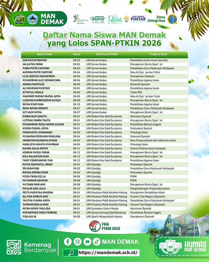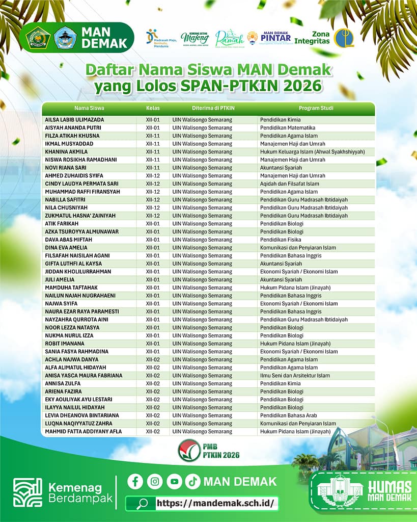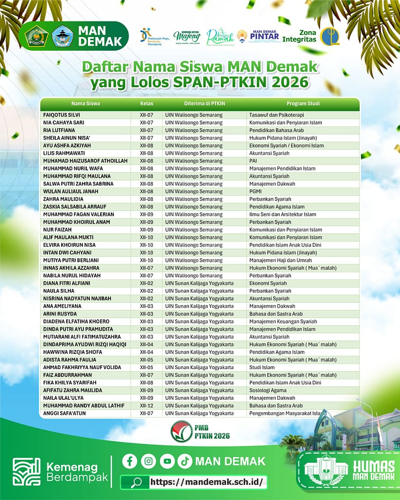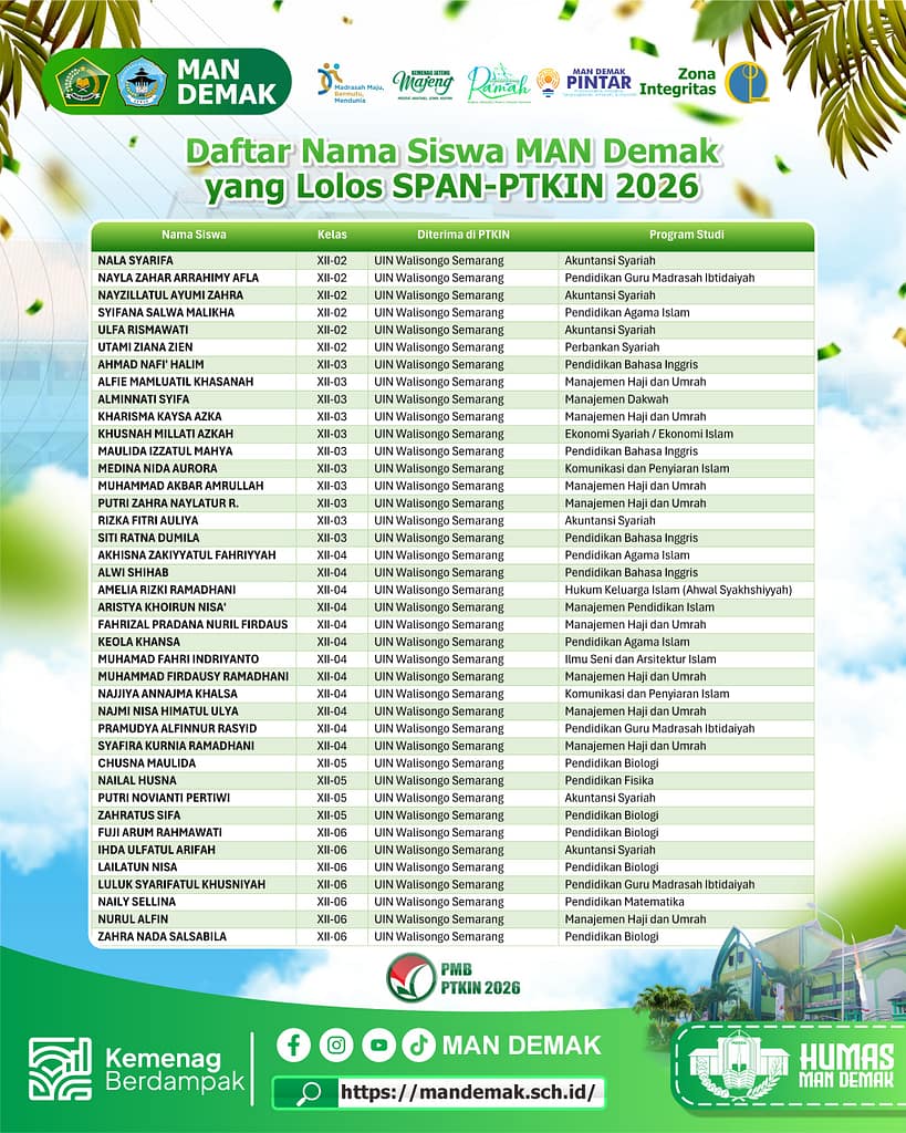 Demak, mandemak.sch.id – Sebanyak 160 siswa MAN Demak berhasil lolos Seleksi Prestasi Akademik Nasional Perguruan Tinggi Keagamaan Islam Negeri (SPAN-PTKIN) Tahun 2026. Capaian ini menjadi prestasi luar biasa sekaligus bukti nyata dari kerja keras, kedisiplinan, doa, serta sinergi yang kuat antara siswa, guru, dan orang tua.