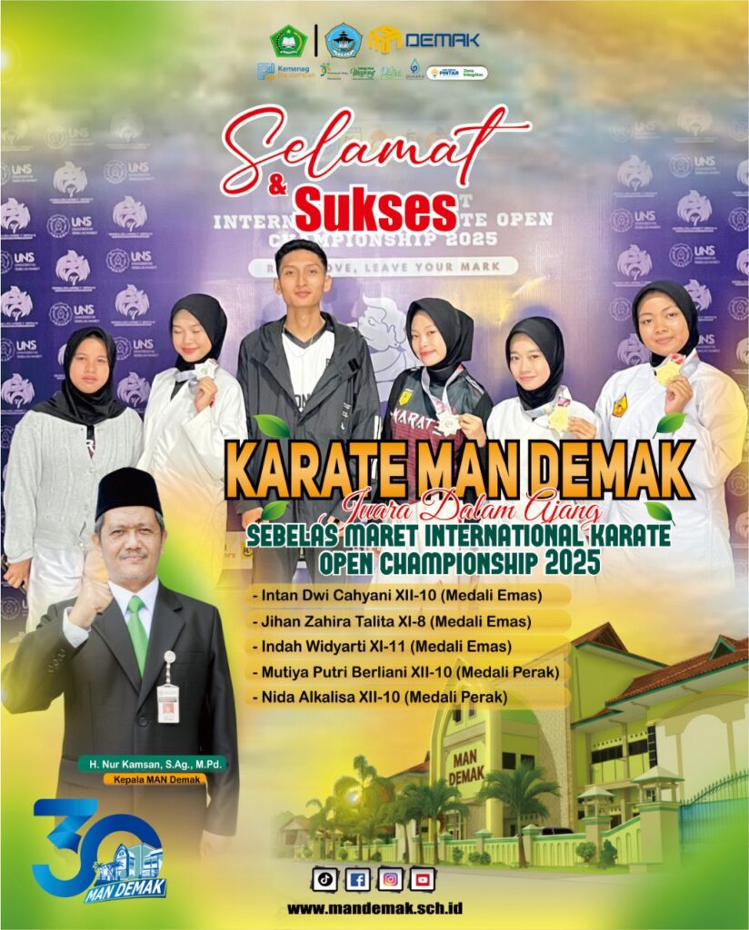 Demak, mandemak.sch.id – Kabar membanggakan datang dari dunia olahraga, khususnya seni bela diri karate. Para atlet terbaik dari Madrasah Aliyah Negeri (MAN) Demak sukses menunjukkan performa luar biasa dalam ajang bergengsi Sebelas Maret International Karate Open Championship 2025 yang diselenggarakan di Universitas Sebelas Maret (UNS), Solo Senin (3/11/25).