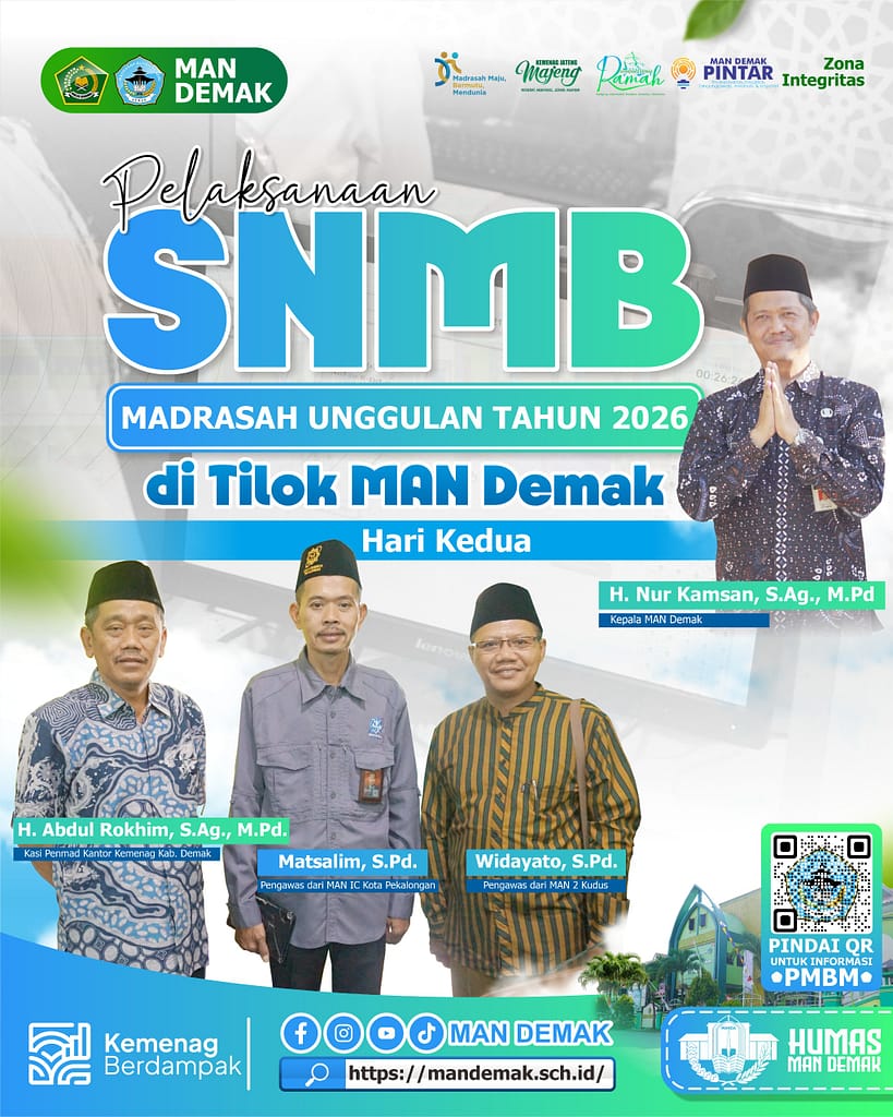 Demak, mandemak.sch.id — Alhamdulillah, pelaksanaan Seleksi Nasional Murid Baru (SNMB) Madrasah Unggulan Tahun 2026 di MAN Demak memasuki hari kedua dengan suasana yang tetap tertib, lancar, dan kondusif Minggu (15/2/26).