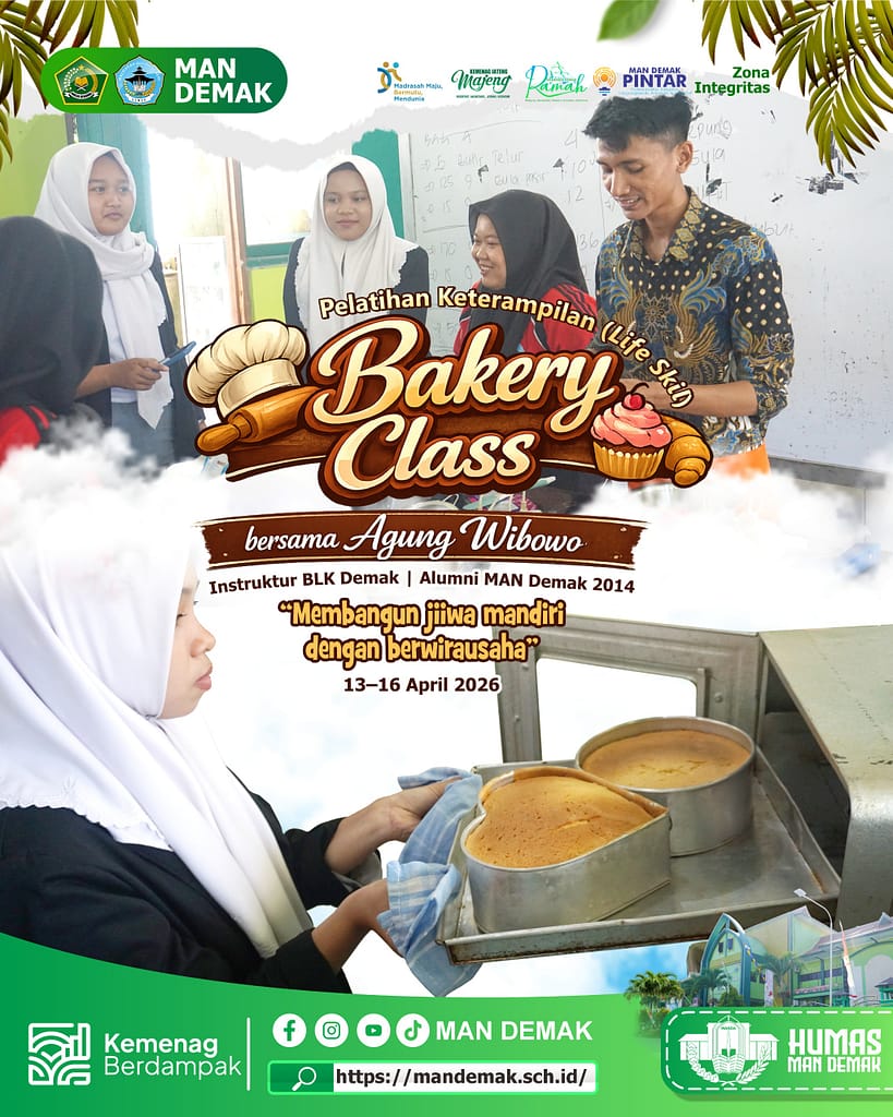 Demak, mandemak.sch.id – MAN Demak terus berkomitmen membekali siswa dengan keterampilan praktis melalui program pelatihan bertajuk “Bakery Class” yang diperuntukkan bagi siswa kelas XII Senin (13/4/26).