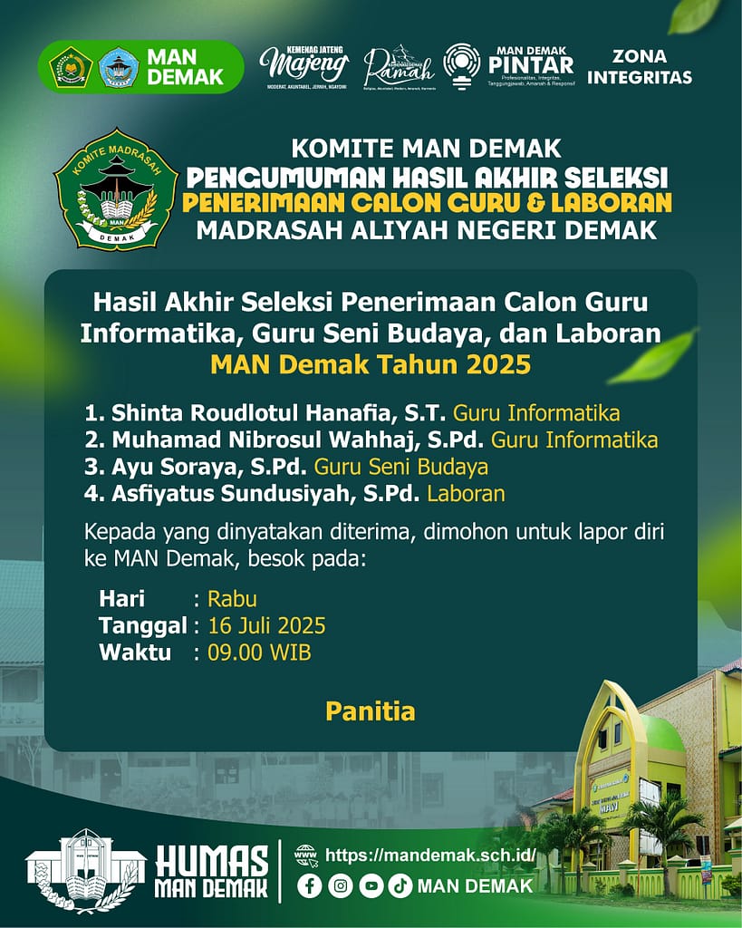 Setelah melakukan proses seleksi yang ketat dan transparan, kami dengan senang hati mengumumkan hasil seleksi akhir calon guru informatika, guru seni dan budaya, dan laboran MAN Demak tahun 2025.