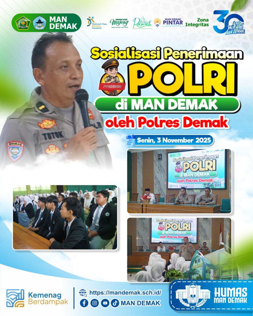 Binmas Polres Demak secara langsung hadir di Aula MAN Demak untuk menyelenggarakan Sosialisasi Penerimaan Anggota Kepolisian Negara Republik Indonesia (POLRI).